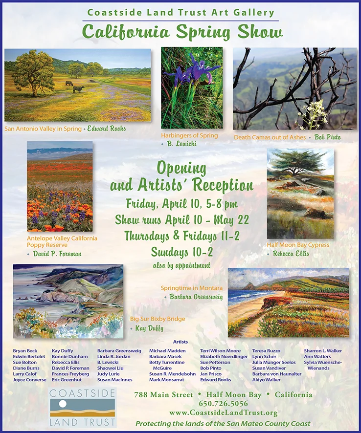 As spring arrives to the San Mateo coast, CLT presents its "California Spring" art show featuring 38 local artists. Meet the artists and see their work at our Opening and Artists' Reception on Friday, April 10th from 5–8pm. The gallery is located at 788 Main Street, Half Moon Bay.