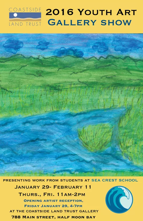 Please join us on Friday, January 29th from 4-7 pm for our Winter Youth Art Show Opening and Artists' Reception. Coastside Land Trust has partnered with Sea Crest School to showcase a wonderfully diverse collection of beautiful, inspiring, humorous and intriguing pieces created by K-5th students. From serene coastal landscapes to pop-art portraits of wildlife, this show highlights the many different techniques and themes that Sea Crest School students have been exploring over the past fall and winter. Please join us for light refreshments and to view their work. The show will run from January 29 – February 11, regular gallery hours are Thursday and Friday 11am-2pm. The gallery is located at 788 Main Street, HMB.