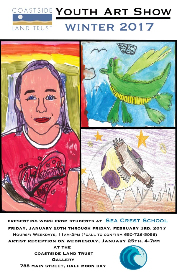 We are excited to announce that the Coastside Land Trust gallery will feature artwork by Sea Crest School K-5th grade students in the 2017 Winter Youth Art Show. Through exploration of different techniques, art principles and themes, Khalid Birdsong has inspired and challenged our young artists to tell a story with each assignment. This year's show, curated by Janicee Forchini, shares these stories in a wonderfully diverse, intriguing and colorful collection of self-portraits, wildlife portraits, coastal landscapes, fantastical scenes and abstract explorations of shape, color and contrast. The show will run until Friday, February 3rd, 2017. Hours*: Weekdays 11am-2pm (*Call to confirm: 650-726-5056)
