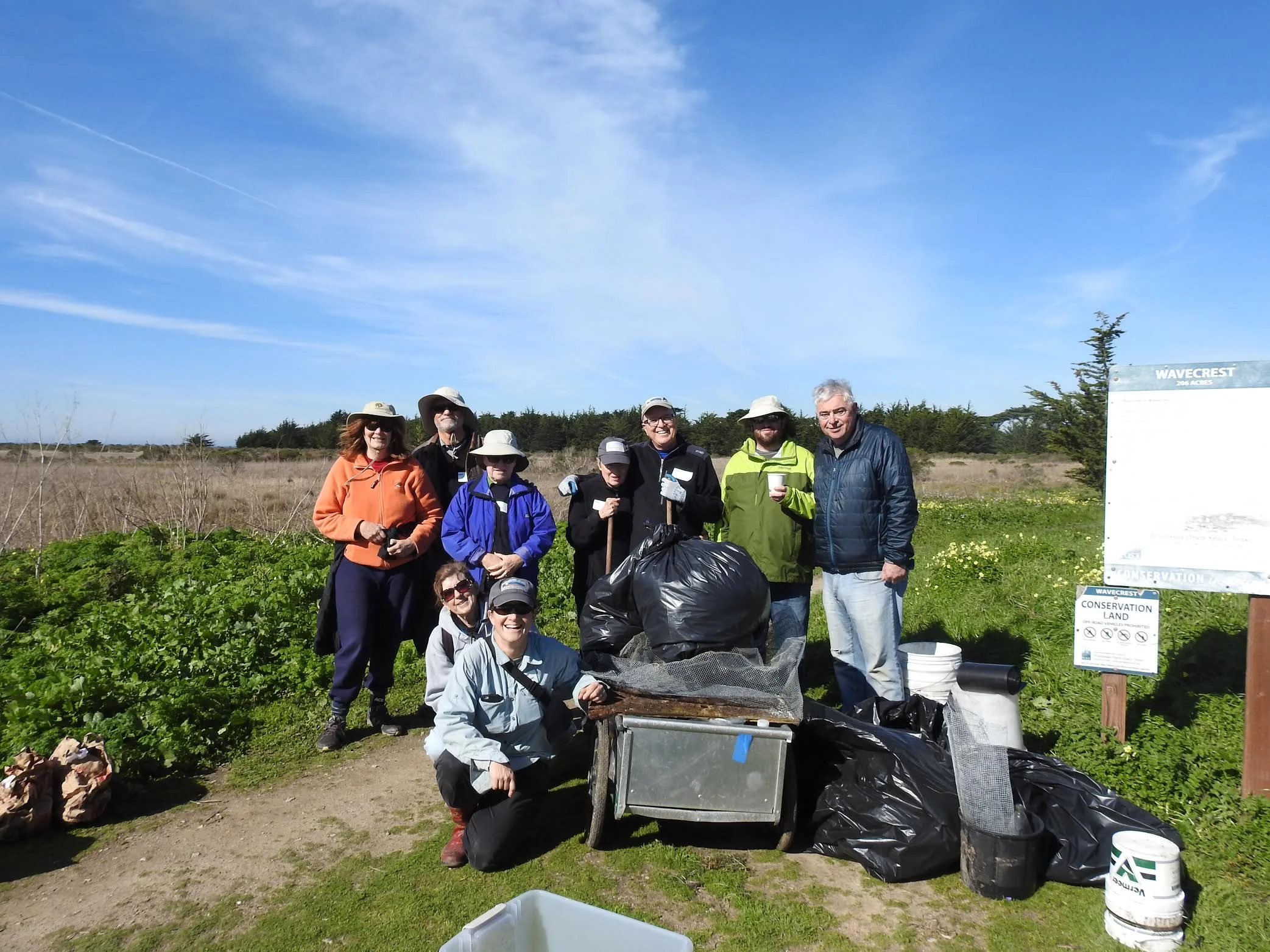 Volunteers pose with trash and invasive species removed from the Wavecrest property.
