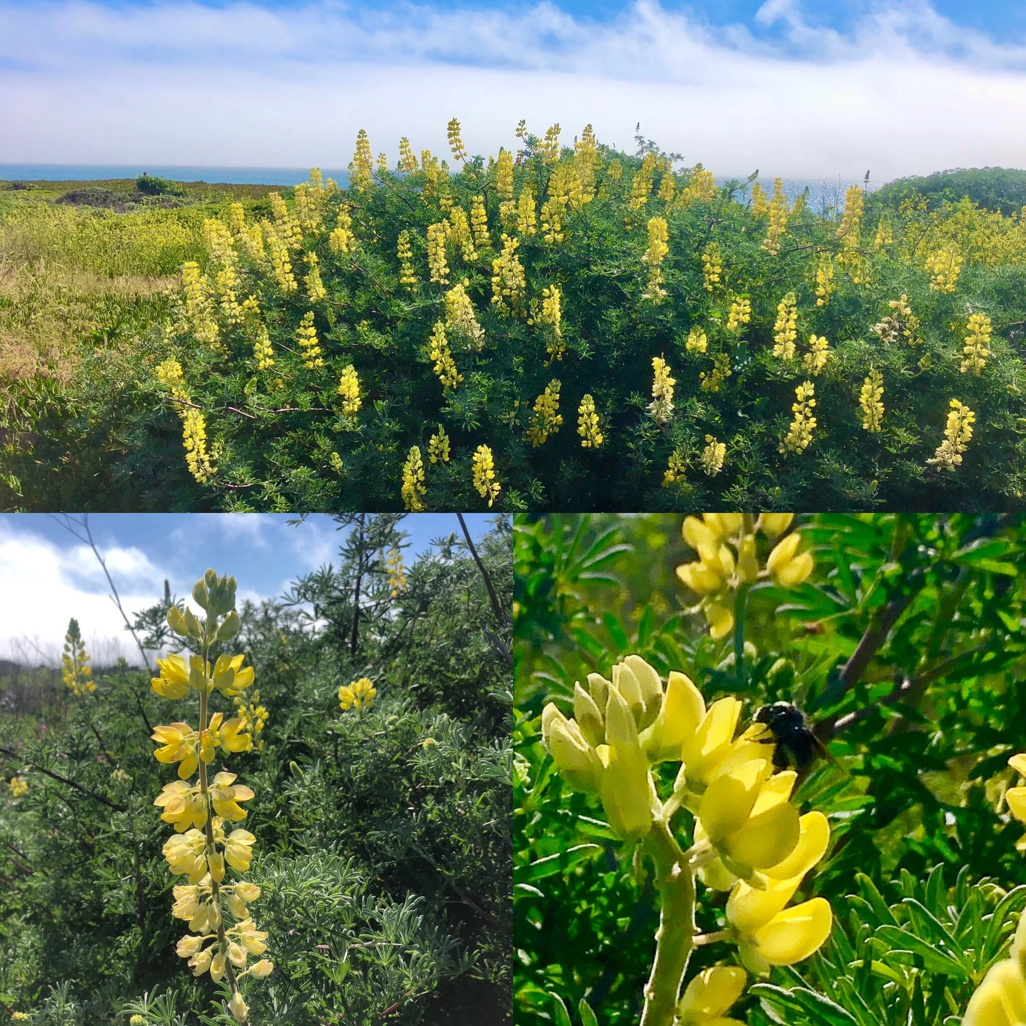 The lupine flowers can be yellow, purple, blue, red, white or bi-colored. There is a large white dot on each small flower, acting as a nectar guide that directs the pollinators to the nectar/pollen source. As the flowers fade, the spots turn bright pink, letting insects know that the nectar and pollen are depleted. Once pollinated the lupine produces a seed pod containing several seeds. When the seed pod becomes dry and brittle, the built-up torsion rips the pod apart and seeds are shot several feet away from the parent plant.