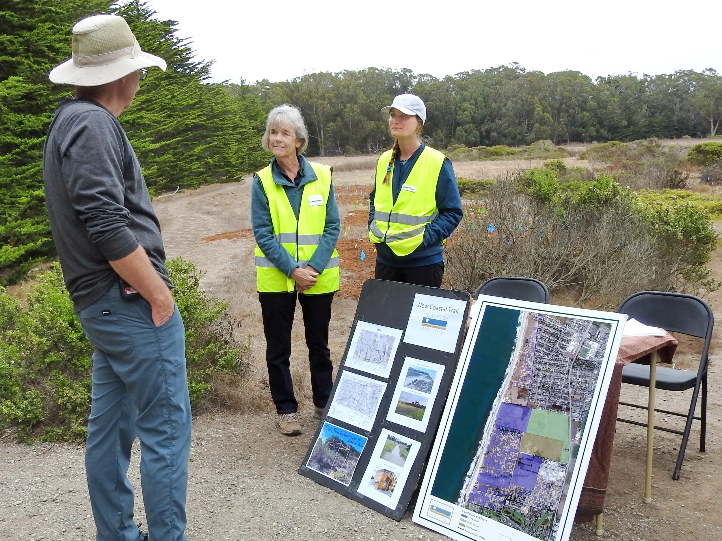 Thank you to the many community members who stopped by our tables this morning to learn and share support for the upcoming coastal trail extension. A wonderful turnout of people stopping by on bikes, with dogs, and out for a hike with cameras, binoculars and/or family and friends. We are looking forward to making this an even more pleasurable space for many people to enjoy- while curbing erosion and rehabilitating the bluff top.