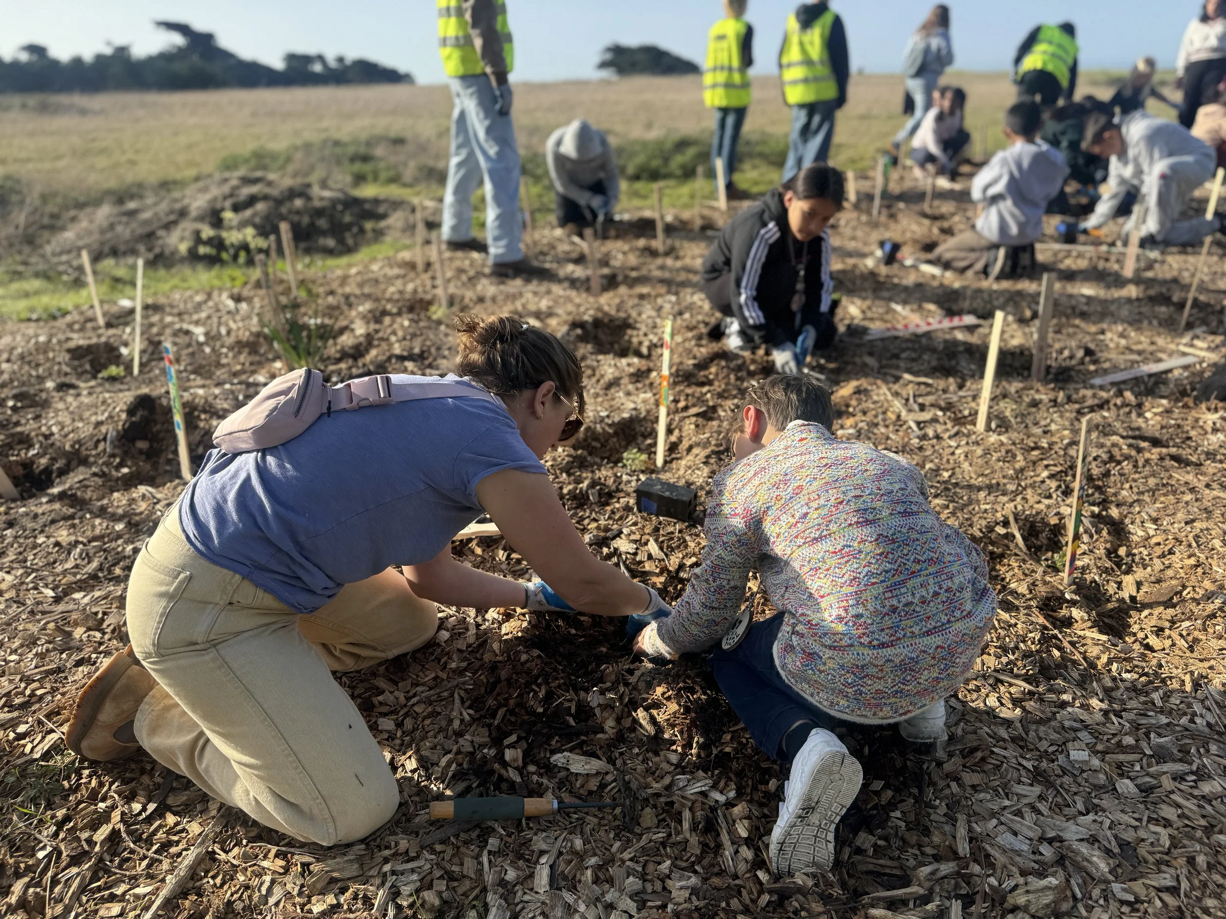 Participating classes from Hatch Elementary (three classes), El Granada Elementary (two classes), Farallone View, and King’s Mountain each contributed to this collective effort. By the end of their field trips, students could clearly see that their individual actions, thoughtful planting, careful observation, and teamwork, add up to something powerful: a healthier coastal prairie and a more hopeful future for the species that depend on it.