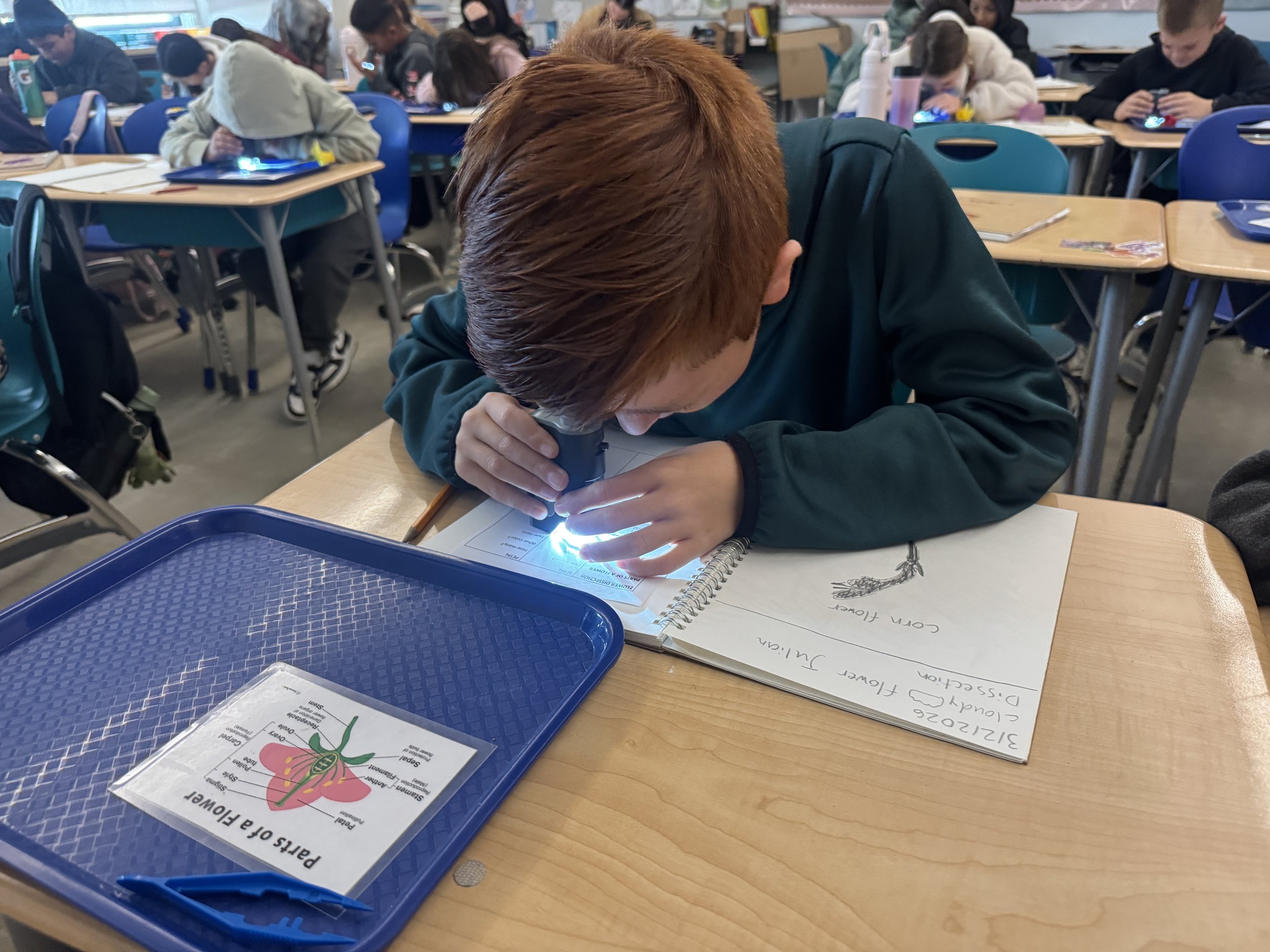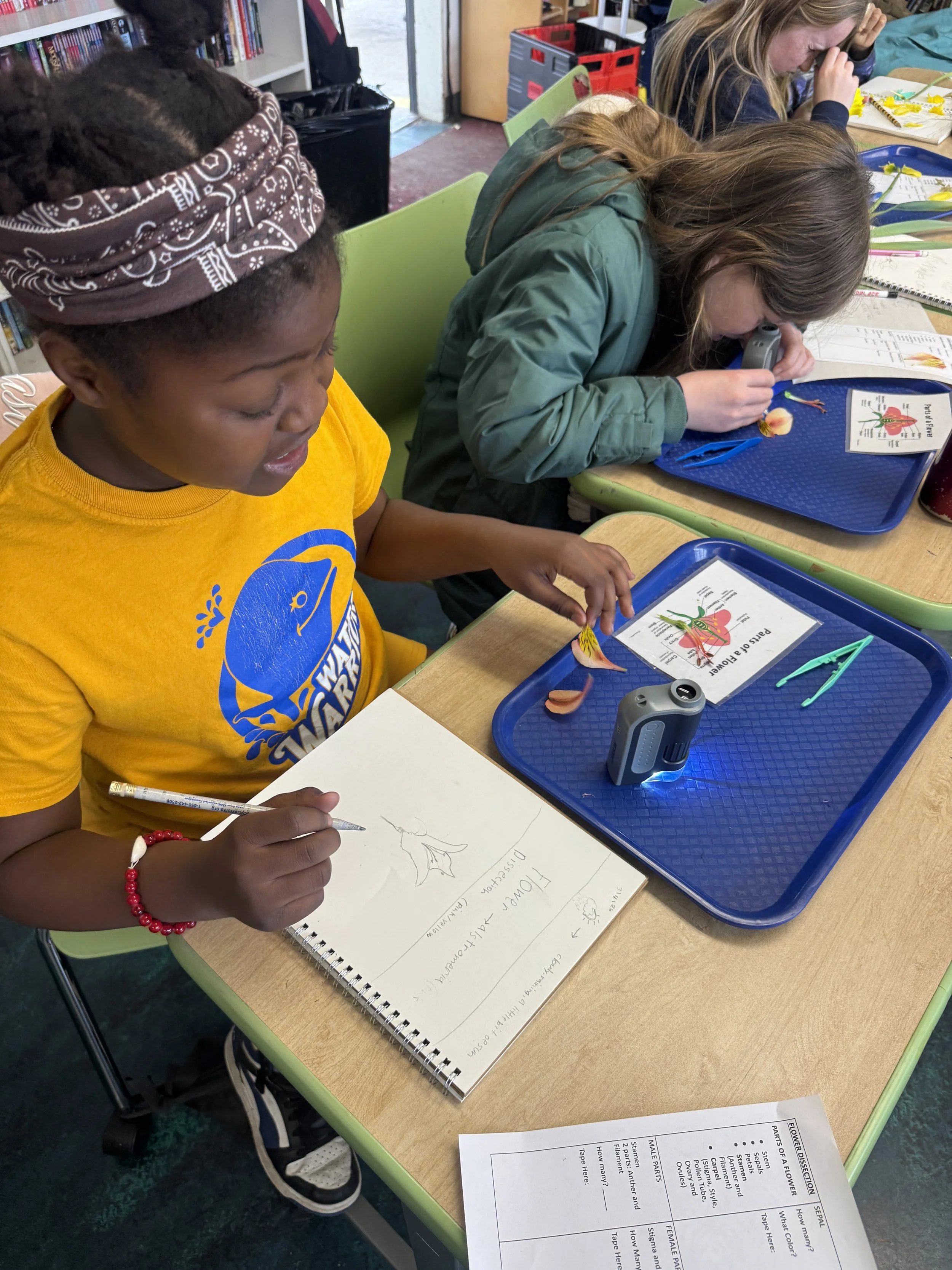 During the dissection, students sketched their flowers, labeled each part on a worksheet, and pressed the flower pieces into their nature journals - a personal record of observation and growing scientific knowledge they'll carry with them all year.