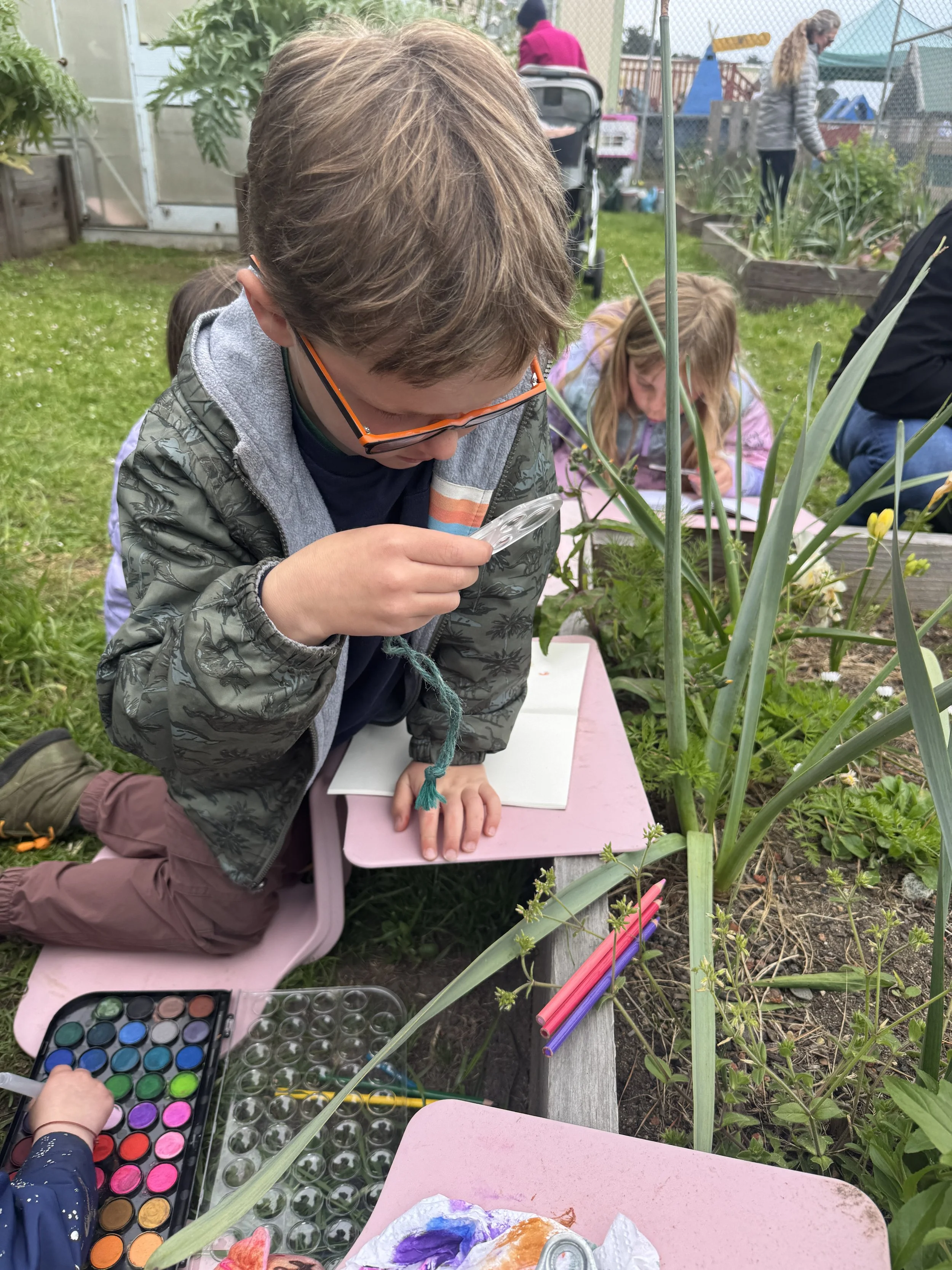 Our enthusiastic 4th graders returned to their beloved pollinator gardens for one last exploration before summer. Armed with nature journals and sharp eyes, they documented changes since their last visit, noting everything from new blooms to unexpected visitors. With the guidance of their high school field guides, students gently weeded around their growing plants and made thoughtful predictions about how their gardens might look when they return.