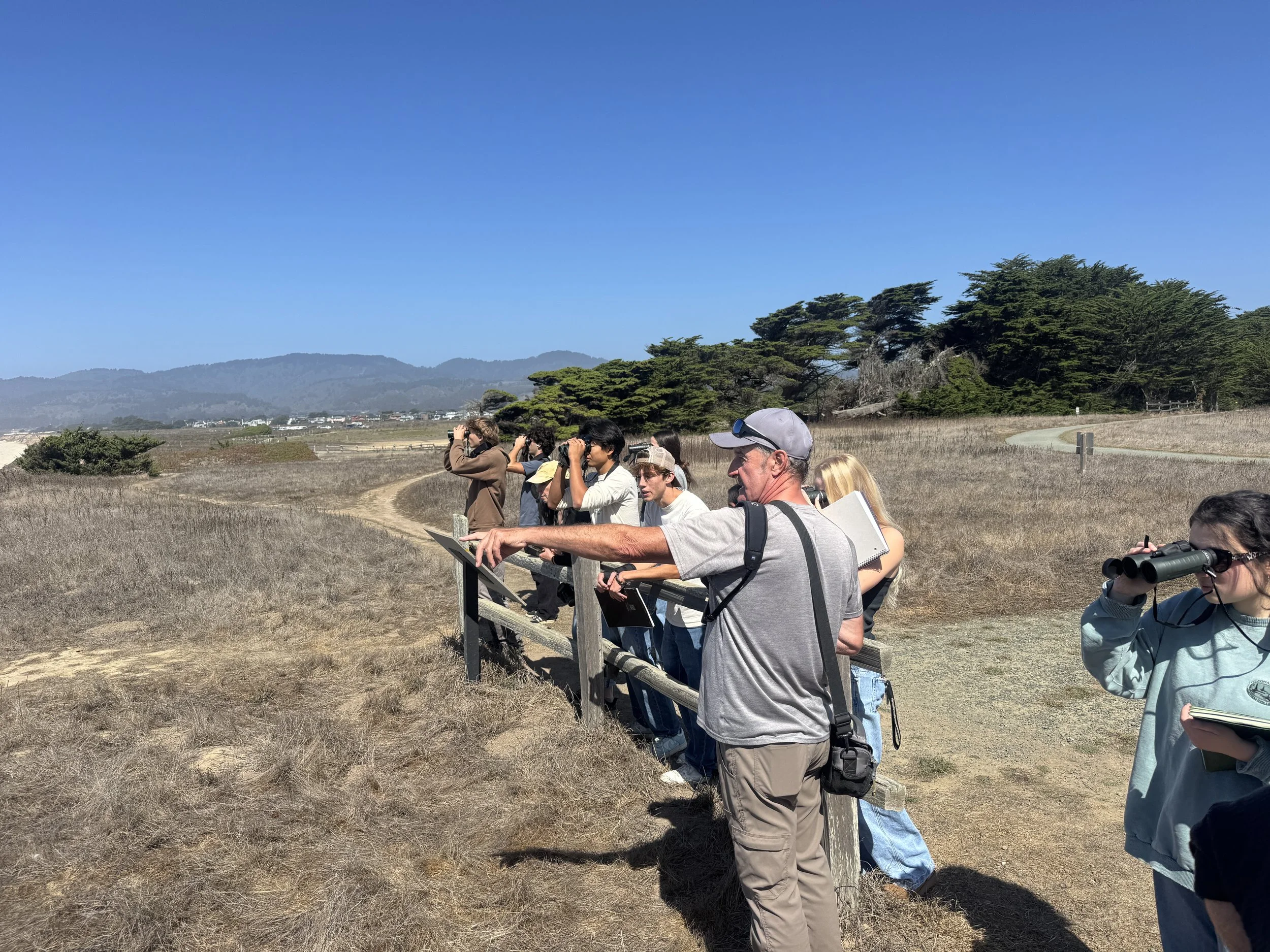 The birds stole the show—students spotted white-tailed kites, northern harriers, American kestrels, red-tailed and red-shouldered hawks, and even an American barn owl. Along the coast, hundreds of seabirds were in a feeding frenzy, including elegant terns, gulls, cormorants, western grebes, and pelicans. Smaller feathered friends like black phoebes, Bewick’s wrens, California towhees, Townsend’s warblers, and goldfinches delighted aspiring birders. But the discoveries didn’t stop in the air—students also encountered praying mantises, a shamrock orbweaver spider, voles, other rodents, and even owl pellets.