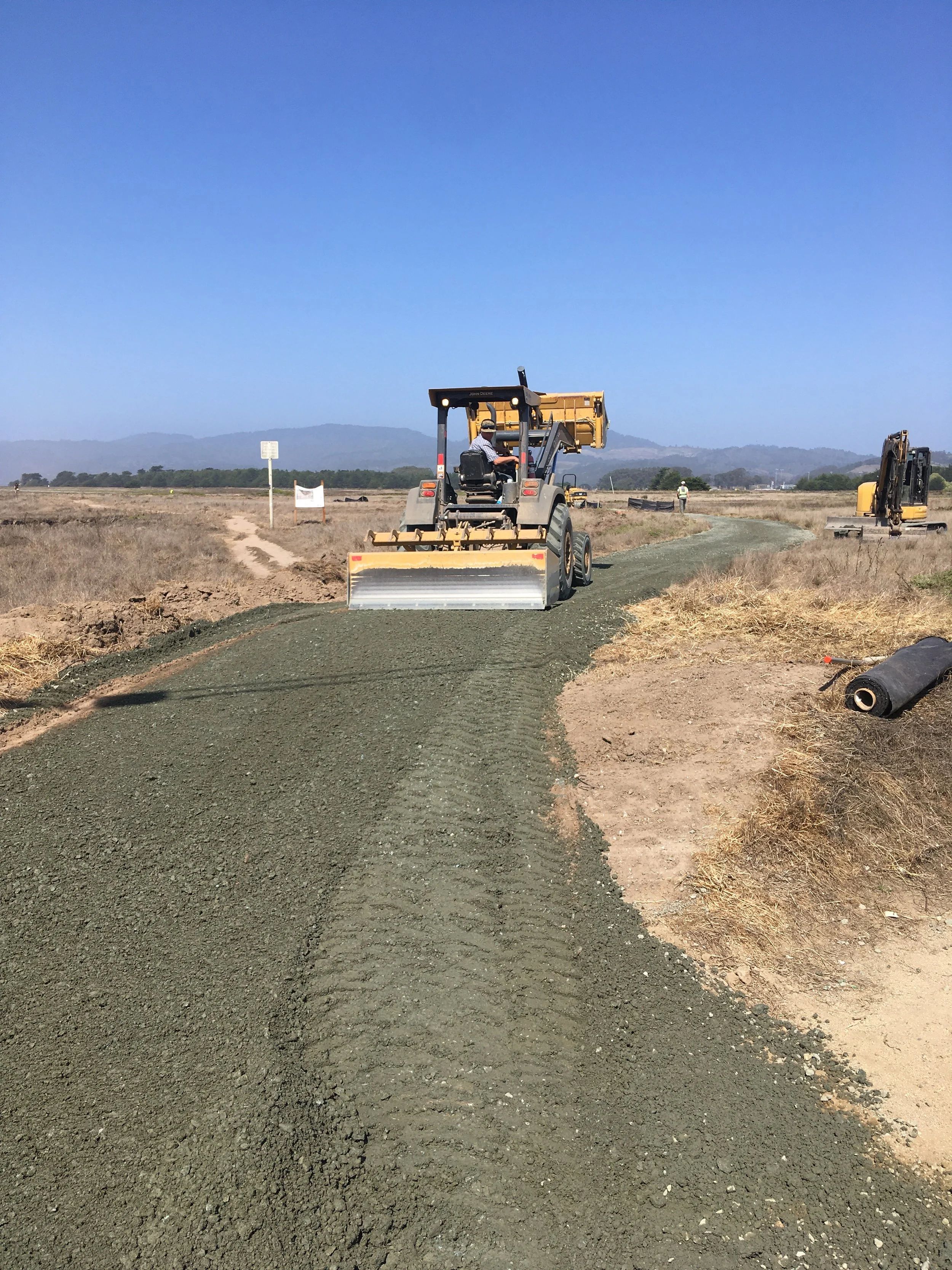 The contractor wrapped up laying compacted gravel on the north side of the ravine—about 1,800 linear feet of trail! This crucial stretch ties together the finished trail on both the north and south sides of the ravine. With this connection nearly complete, the Coastal Trail at Wavecrest is so close to being fully linked!