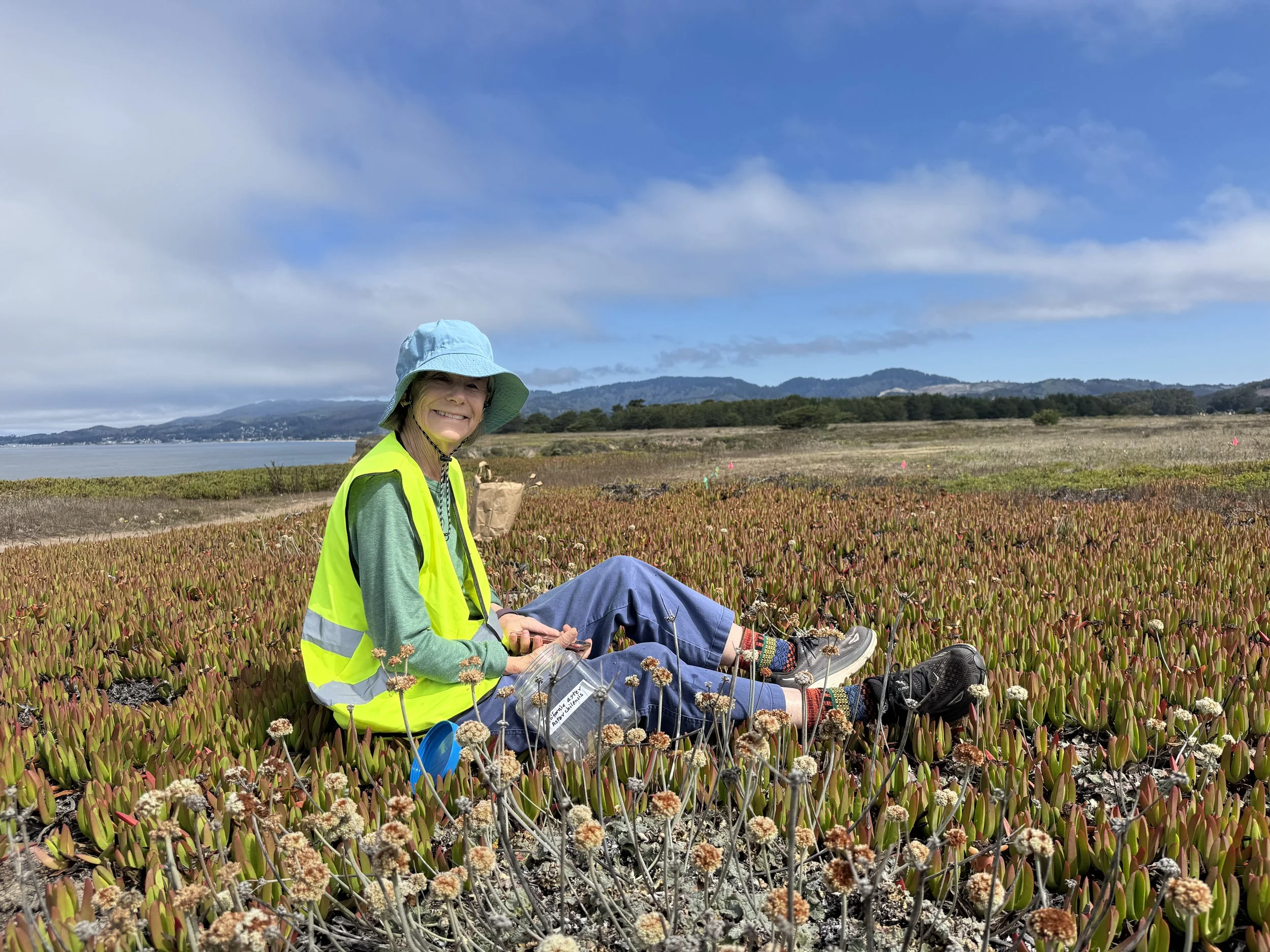 Out at the Wavecrest Open Space, our Board President, Barbara Lohman, carefully gathers seeds from California buckwheat. It may look like a small act, but these seeds will help restore native plants and heal the “casual trails” left by many footsteps.